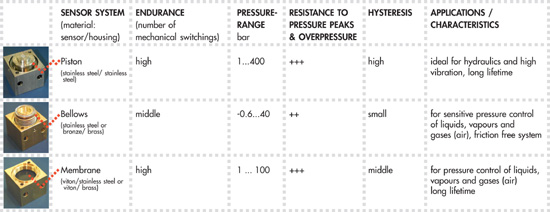 All pressure switches are equipped with a clamp or plug-in connection.Temperature ranges (°C)