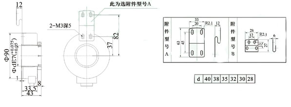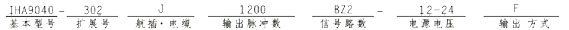 基本型号IHA9040,矩形插座测出J,脉冲数1200p/r,A、B、Z三路信号,Tz=1/2T,电源电压DC12-24V,互补输出F;