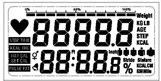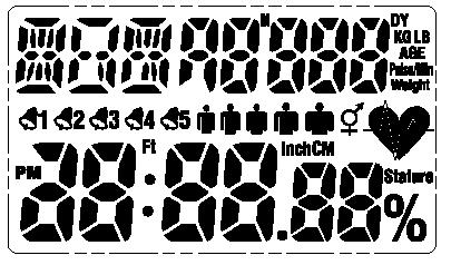 △ 1.     IC工作电压:3.0V。 2.       LCD顶部显示是:每天所消耗卡路里与每天所设置消耗卡路里的百分比,除了设置界面和心跳/体脂测量…