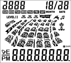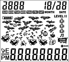 △ 电压: 3.0V 功能: 同屏显示年月日星期时分秒游戏演示 万年历 闹铃 计算器 世界时 夏令时 倒计时 赛车游戏 按键: 按键定义:共28键 主模式键: TIME SET ALM