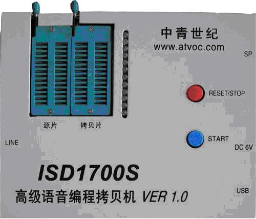 ISD1700S-USB语音编程拷贝机 USB 接口的 ISD 系列编程拷贝机,无须任何驱动程序。秉承了上述编程器操作简易,使用方便的优点;在此基础上, 采用 USB 接口输入声音,进一步减小了噪音,提高芯片的音质