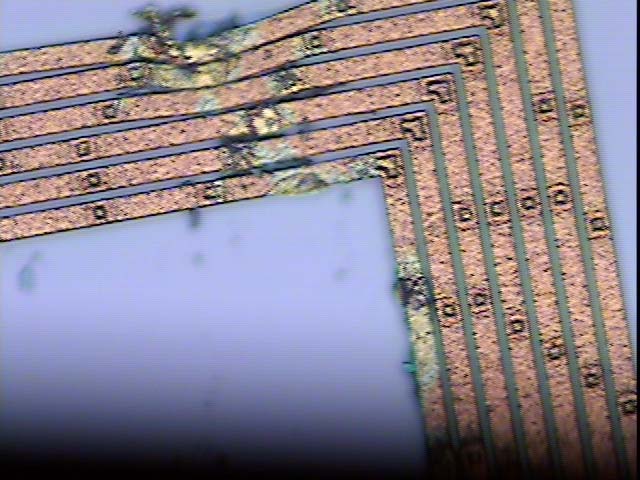 若发现有表面有异常,主要分为两种情况: 一种是,芯片表面存在微小坑点,且上方镀金层颗粒完好无损,如图1。这个属于正常现象。 Hittite的管芯器件满足军用级要求(MIL-STD-883)。在外观检查上,MIL-STD-883 Method 2010有明确的检查标准: No device shall be acceptable that exhibits the following defects in the operating metallization.