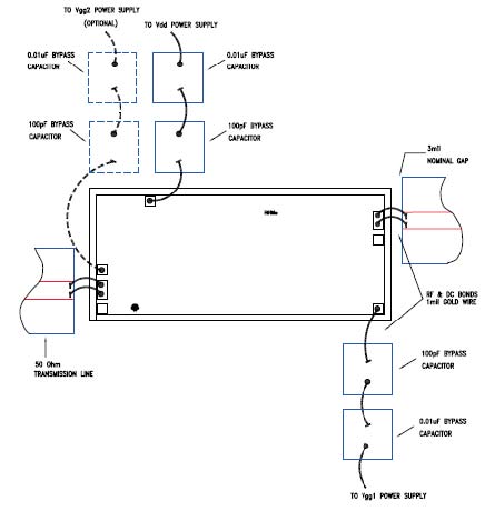 存储:从生产到运输,管芯都必须保存在防静电环境里。一旦防静电袋子开封,管芯就应该保存在干燥的氮环境里。 清洁:装配过程中,确保环境干净。不能用酒精等液体清洁管芯。 移动:移动管芯时,只能用镊子或者真空夹头夹住芯片的边缘。管芯表面是脆弱的空气桥,所以绝对禁止镊子、手指等接触。 焊接:管芯底部金属要直接接地,以保证器件的射频性能,并达到良好的散热作用。 搭金丝:微带线和管芯间的搭线为纯金丝,直径为0.025mm(1mil)。搭接时,应该先连管芯再连接微带线或者其他封装。搭线的长度越短越好,一般小于0.31mm(12mil) 3、产品应用在指标上,与相同型号的塑料或者陶瓷封装产品基本一致。 放大器的应用:以HMC463为例说明放大器的应用。HMC463是宽频带2.0-20.0GHz的GaAs MMIC低噪声放大器。 图5 HMC463应用电路 Vdd是供电+5V电源供电。 Vgg1是栅极负压供电,调整Vgg1电压值改变漏极电流。正常情况Idd=60mA,Vgg1的电压范围在-1.5V - -0.5V之间,典型值为-0.9V。