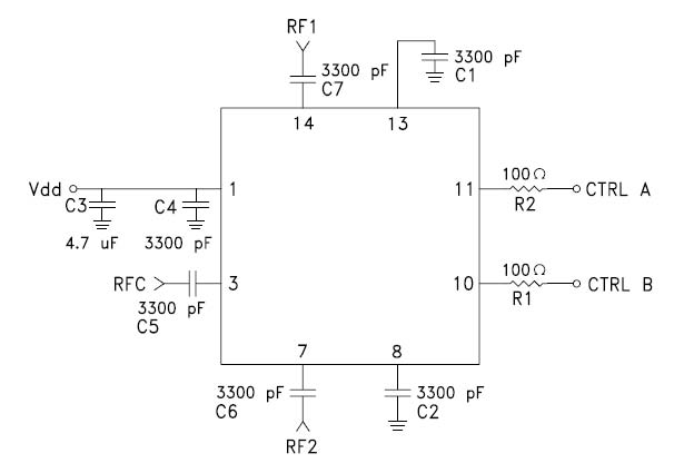 在500MHz以下的电路应用中, 图中C1/C2电容对隔离度的影响非常明显. 为了使开关有理想的隔离度,这个两个3300p的电容是必不可少的.