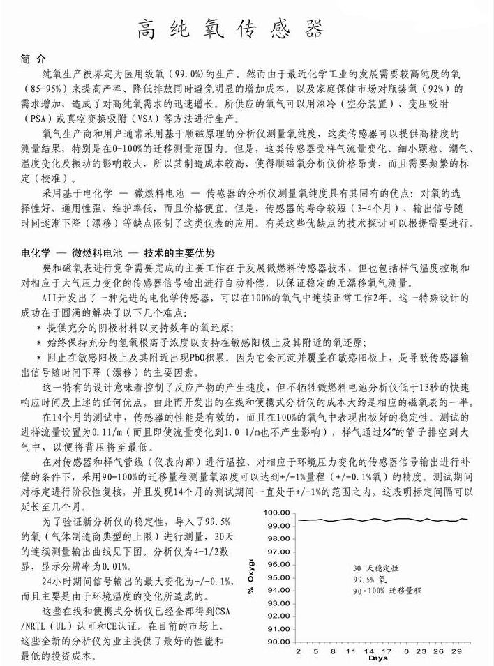 AII/ADV公司所开发的传感器对氧有极好的选择性,要可以测量低至小于1ppb、高到100%的氧。样气中的氧在敏感电极上发生化学反应,产生和浓度成比例的电流信号。所输出的电流信号在指定的所有测量内均为线性,并且在整个正常使用寿命周期内保持不变。其它竞争者所制造的传感器很难与之相比。