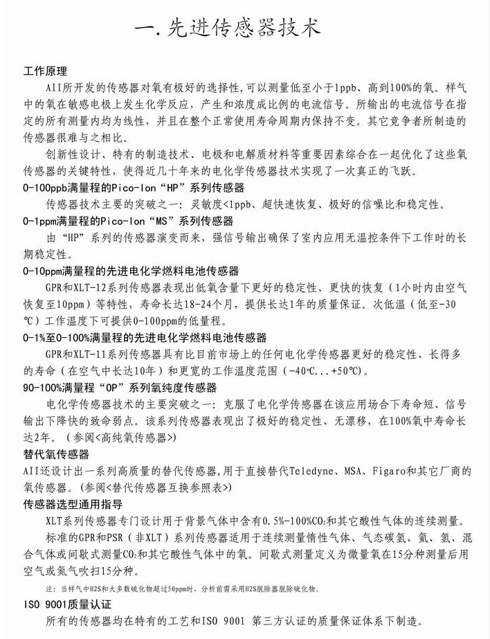 传感器选型通用指导GPR-13-2000UHP氧气传感器、GPR-12-2000MS氧电极、GPR-12-333氧电池、GPR-11-32-4氧燃料电池、PSR-12-223氧电极、XLT-12-333、GPR-12-100-M、XLT-12-100-M、GPR-11-120-OP、GPR-11-120-RTS、GPR-11-120-4、GPR-11-32-4、GPR-11-60-4、GPR-11-75-F、GPR-11-60、XLT-11-24、XLT-11-32-4、XLT-11-32-RT、GPR-11-21-RT、A-2675氧燃料电池、GPR-11-32-4OSV-31-1、OSV-42-1、PSR-12-223、XLT-12-223、PSR-11-15D、9212-0、PSR-11-21、GPR-11-917-J、PSR-11-37-4、PSR-11-75-KE氧电池、SAF-11-02-E、SAF-11-02-I氧电极、XLT-11-15氧气传感器,AII氧分析仪GPR-1200/GPR-1100GPR-1500传感器:GPR-12-333/GPR-12-100-M或酸性电池XL-12-333;AII氧分析仪传感器GPR-2000配GPR-11-21-RT/XLT24-RT;纯氧分析仪变送器GPR-2500MO配1-120-4氧分析仪传感器常量氧变送器GPR-2500配GPR-11-32-4或酸性电池XLT-11-32-4。AII氧气传感器专门设计用于背景气体中含有0.5%-100%CO2和其它酸性气体的连续测量。合气体或间歇式测量CO2和其它酸性气体中的氧。间歇式测量定义为微量氧在15分钟测量后用空气或氮气吹扫15分钟。
